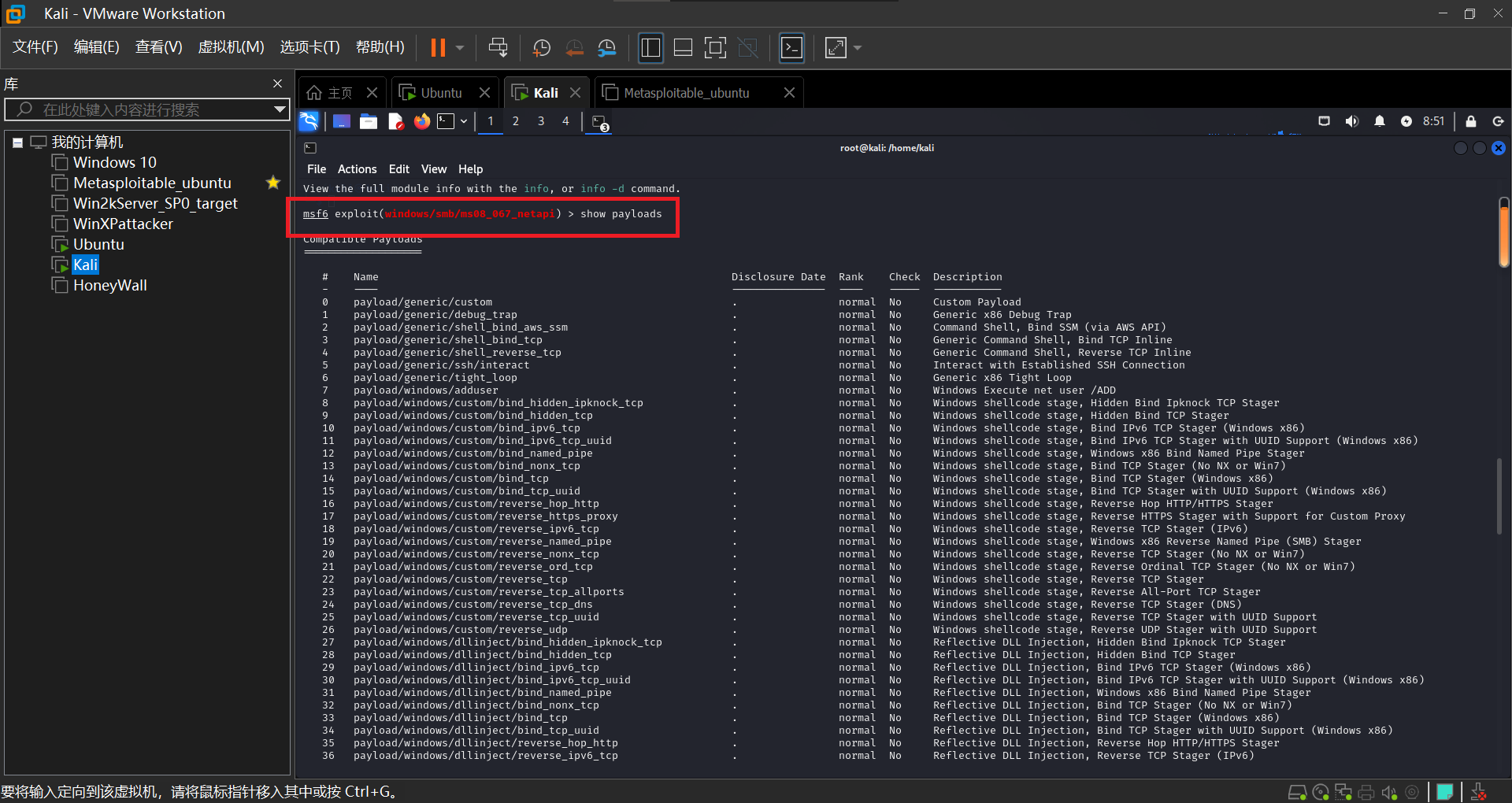 输入以下命令显示可用的攻击负载'show payloads'