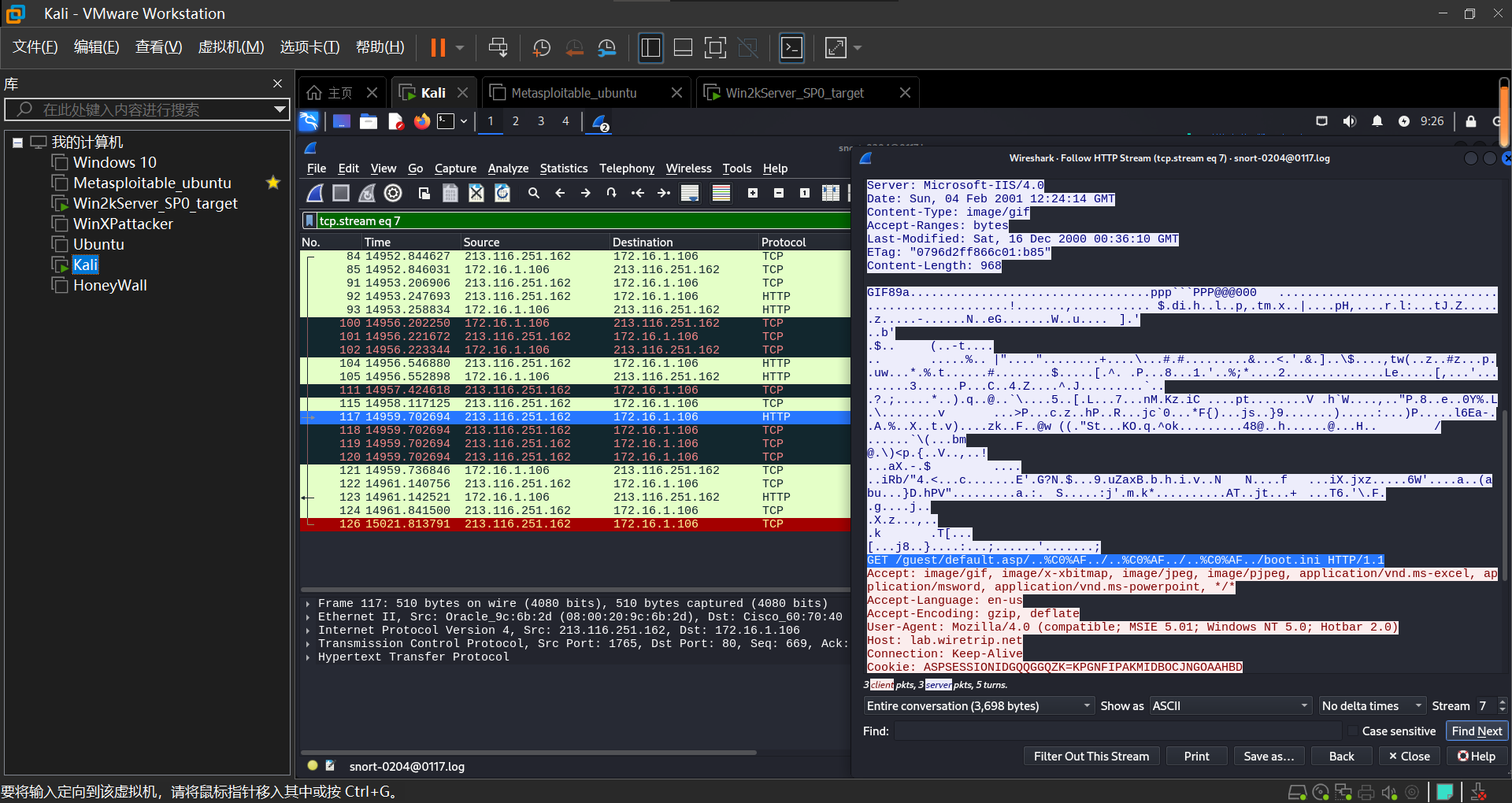开始观察,发现第117行出现一个字符 %C0%AF,查看TCP流