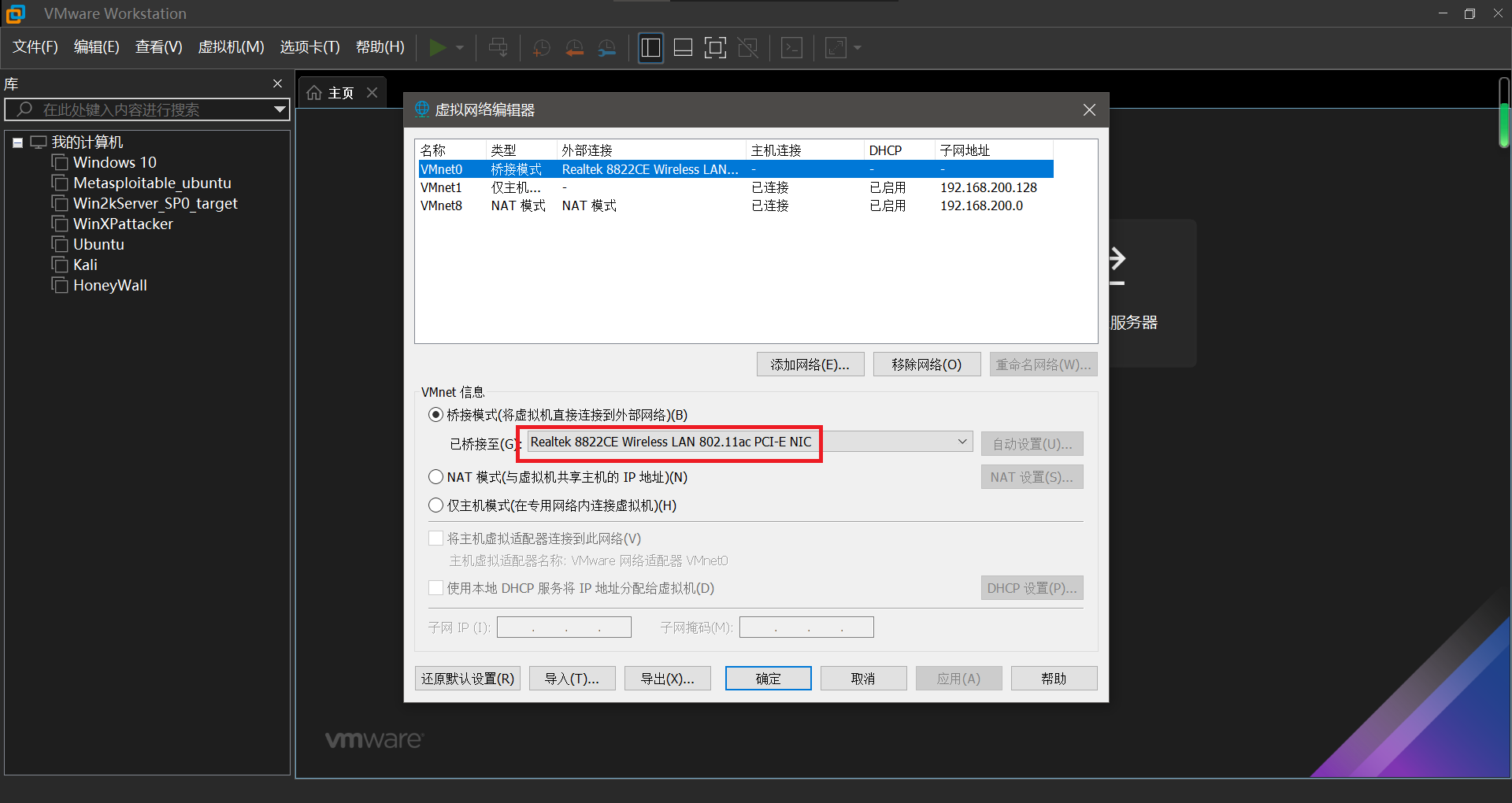 为了实现在同一网段下,必须得将二者均采用桥接模式或者将Vmnet0设置为桥接模式(注意,由于均是笔记本连接wifi做实验,必须得将桥接的网卡设置为无线网卡,两人的无线网卡选择同样的网络(具体操作可见第三章的问题1),否则将连接不上外界主机网络,导致实验双方不能在同一网段)