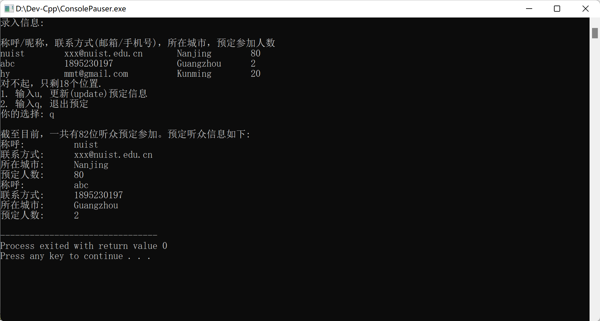 #include <iostream> #include <vector> #include <string> #include "info.hpp" using namespace std; int main() { vector <Info> audience_info_list; const int capacity = 100; string nina, con, ci, choice; int total_num = 0, cin_num = 0, i = 0; cout << "录入信息:" << endl; cout << endl; cout << "称呼/昵称,联系方式(邮箱/手机号),所在城市,预定参加人数" << endl; while (cin >> nina >> con >> ci >> cin_num) { if (total_num + cin_num <= capacity) { audience_info_list.push_back(Info(nina, con, ci, cin_num)); total_num += cin_num; i++; } else { cout << "对不起,只剩" << capacity - total_num << "个位置." << endl; cout << "1. 输入u, 更新(update)预定信息" << endl; cout << "2. 输入q, 退出预定" << endl; cout << "你的选择: "; cin >> choice; if (choice == "u") audience_info_list.pop_back(); else if (choice == "q") break; } } cout << endl; cout << "截至目前,一共有" << total_num << "位听众预定参加。预定听众信息如下:" << endl; for (int j = 0; j < i; j++) audience_info_list[j].print(); return 0; }