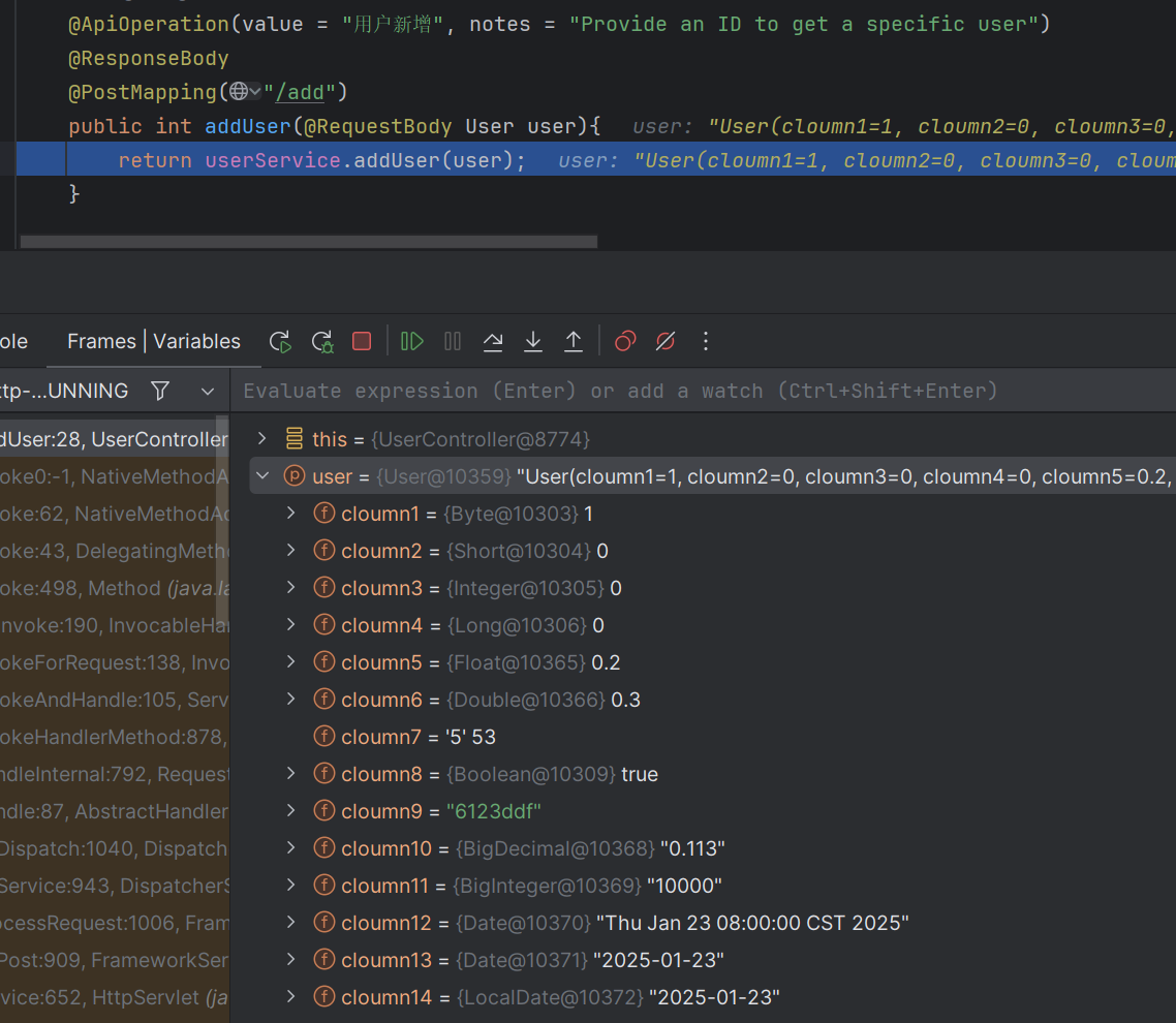 可以看到参数都能够正确接收到,并且根据实体对象类型进行了转换,入库之后如下所示: