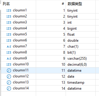 首先创建了一个如下涵盖大部分mysql数据类型的表: