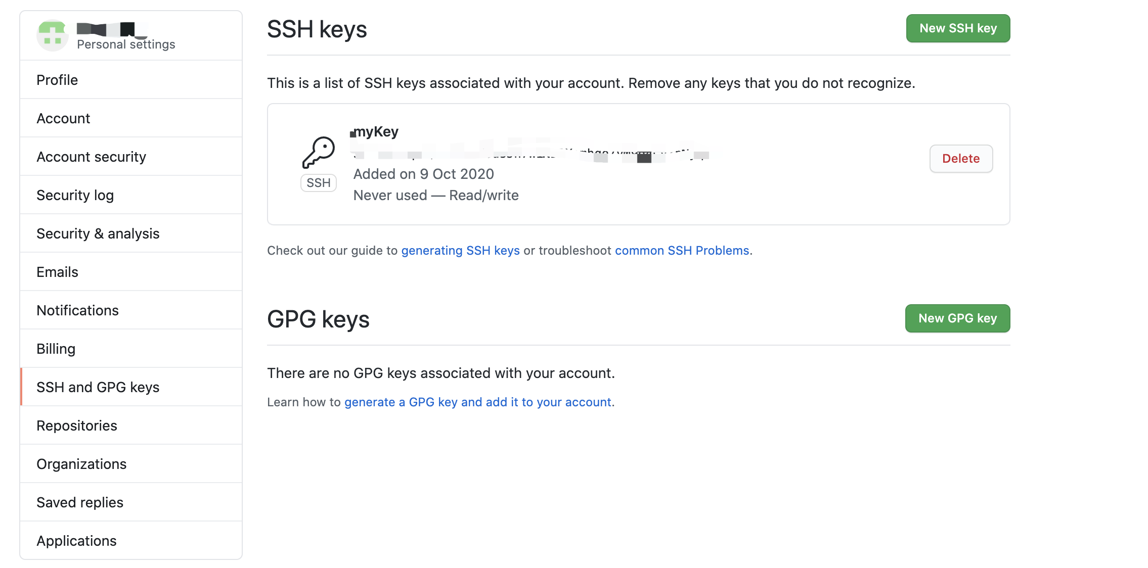 然后 复制全部 打开github (这里我是给github配置公钥 如果您是gitLab请打开gitLab的 ssh keys 进行填写即可)