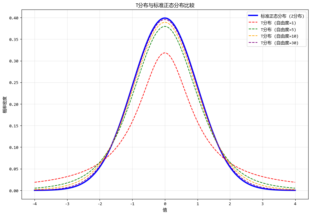 随着收集到的数据量不断增加,我们会观察到T分布逐渐趋向于标准正态分布,也就是我们常说的Z分布。