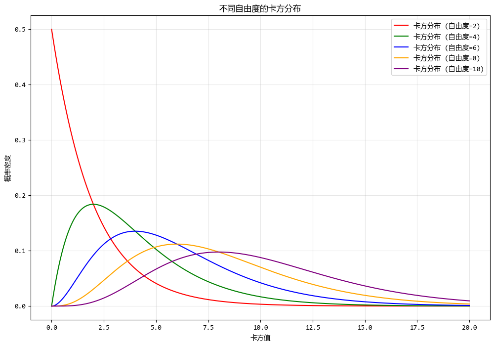 使用测试数据绘制不同自由度的卡方分布图形如下: