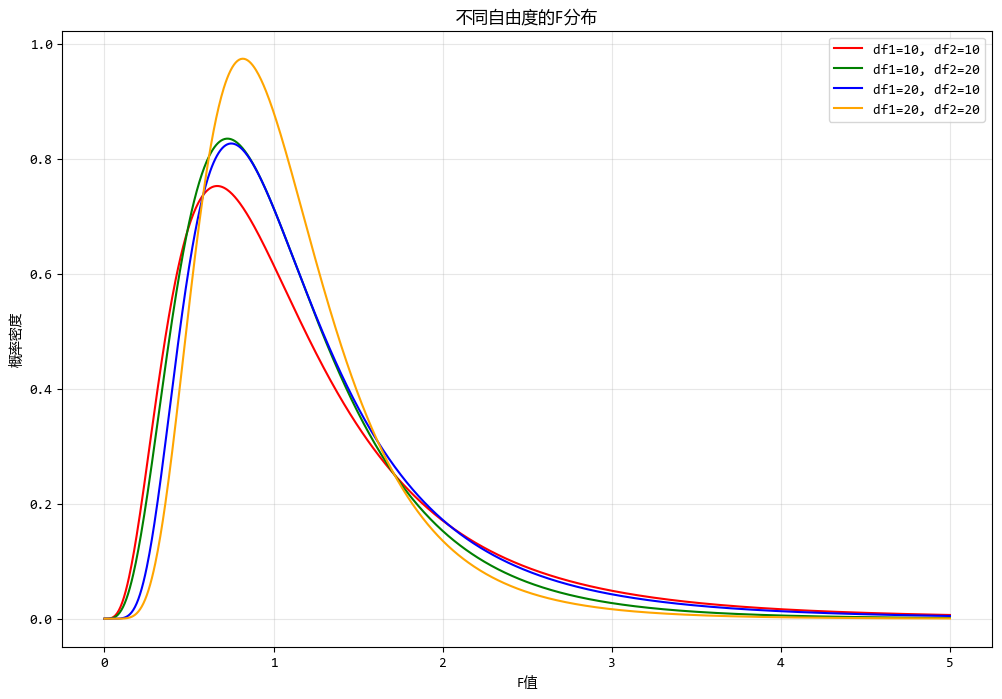 使用测试数据绘制不同自由度的F分布图形如下: