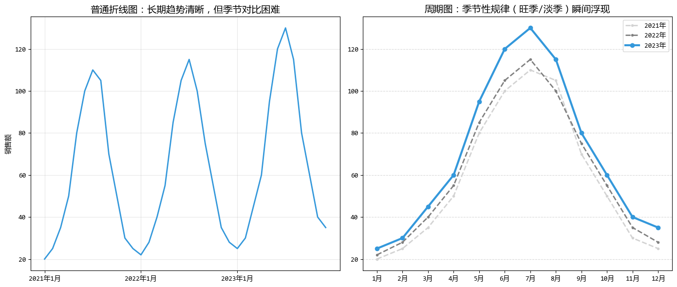 - 右图(周期): 就像把每年的数据“叠”在了一起。你可以直接看到,无论哪一年,7月都是最高峰,而12月都是低谷。规律一目了然。