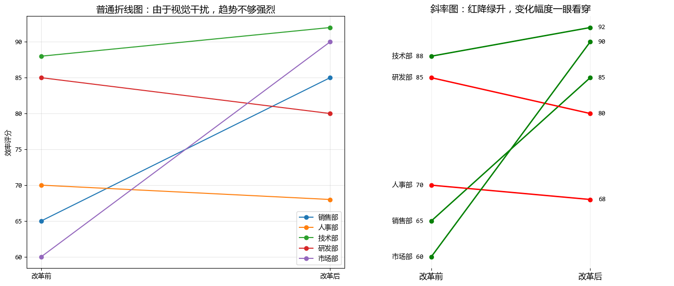 - 斜率图:适合比较两个时间点的变化,直观展示变化幅度