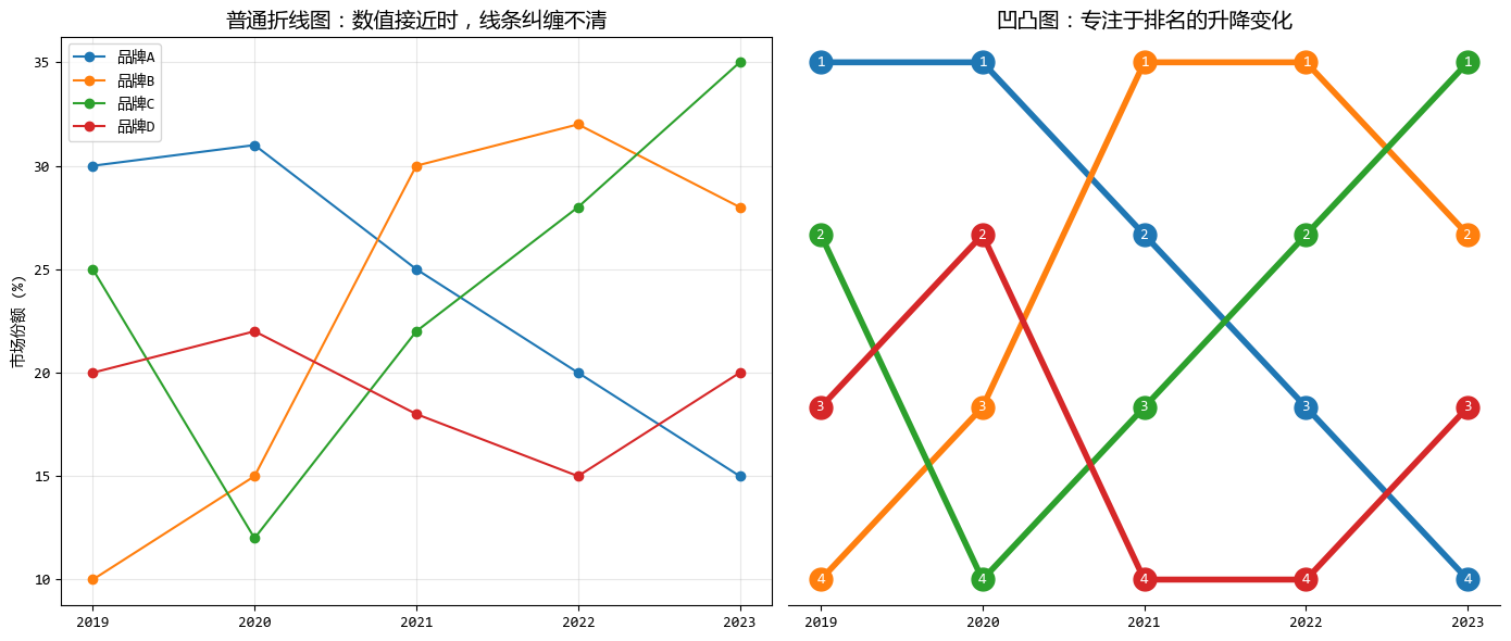 - 凹凸图:适合展示排名或相对位置的变化,竞争关系一目了然