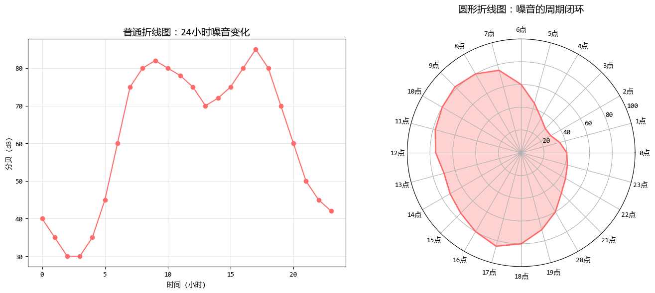 - 圆形折线图:适合展示周期性数据,首尾相接的设计强调循环