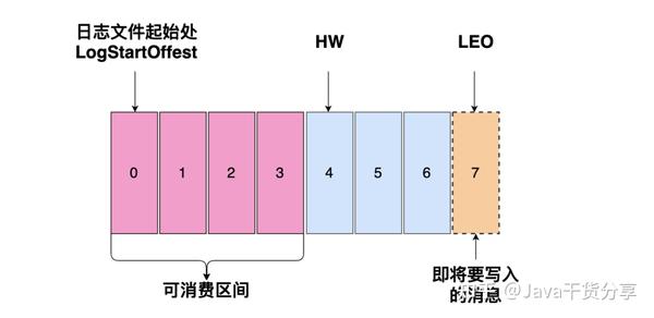 HW(High Watermark) 为4,0~3 代表这个日志文件可以消费的区间,消费者只能消费到这四条消息。