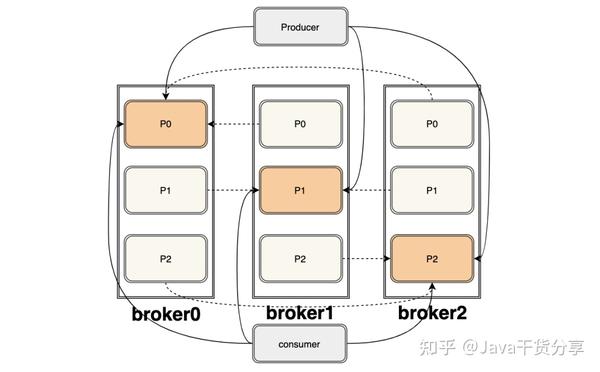 图中共三个 broker,里面各有三个副本,总共有三个partation, 深色的是leader,浅色的是follower,上下灰色分别代表生产者和消费者,虚线代表follower从leader拉取消息。