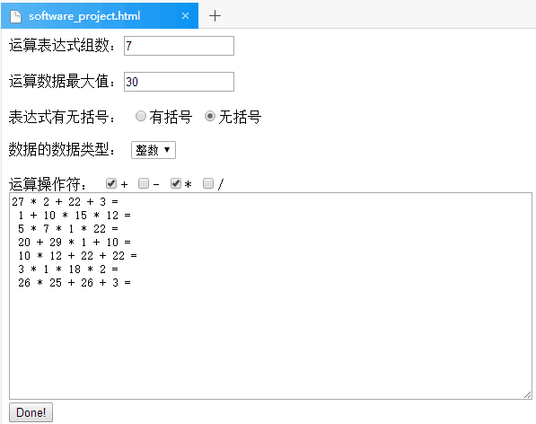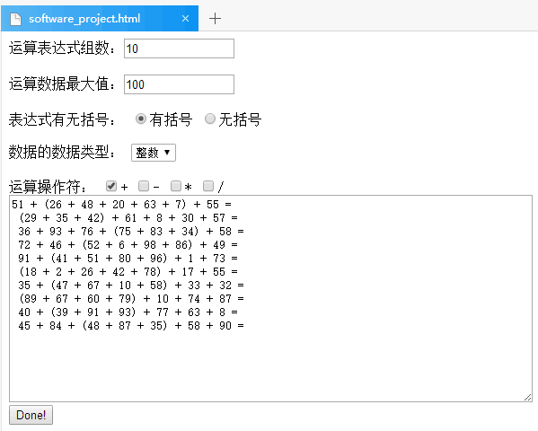 四则运算问题,关键是能够自动生成算数表达式。在这部分中,我们整体代码采用C++和结构体进行设计。而针对页面显示结构,我们则采用了html以及js进行设计。我们给出表达式的组数、表达式中涉及到的数据的大小范围以及数据类型。除此之外,还要考虑到生成的表达式是否含有括号、具体包含哪些运算符等。因此,我们在代码中进行了详细分析设计,并且进行了重构,从而使得代码整洁、可修改性强。