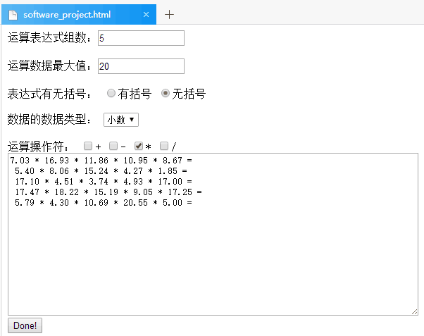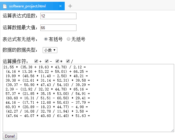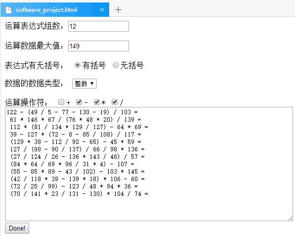 (2)选择多操作符进行表达式的生成,包括整数、小数、有无括号的形式。