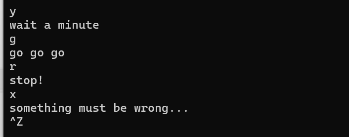 1 #include <stdio.h> 2 3 int main() 4 { 5 char light; 6 while(scanf("%c",&light) != EOF){ 7 8 getchar(); 9 switch(light) 10 { 11 case 'r': 12 printf("stop!\n"); 13 break; 14 case 'g': 15 printf("go go go\n"); 16 break; 17 case 'y': 18 printf("wait a minute\n"); 19 break; 20 default: 21 printf("something must be wrong...\n"); 22 break; 23 } 24 } 25 26 return 0; 27 28 }