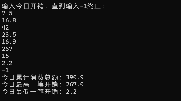 #include <stdio.h> #include <math.h> int main() { double n; double sum,max,min; sum = 0, max = -INFINITY, min = INFINITY; printf("输入今日开销,直到输入-1终止:"); while(1){ scanf("%lf",&n); getchar(); if (n == -1) break; else { sum += n; if (n > max) max = n; if (n < min) min = n; } } printf("今日累计消费总额:%.1lf\n",sum); printf("今日最高一笔开销:%.1lf\n",max); printf("今日最低一笔开销:%.1lf\n",min); return 0; }