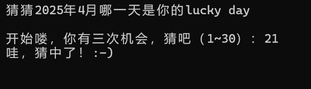 1 #include <stdio.h> 2 #include <stdlib.h> 3 #include <time.h> 4 5 int main() { 6 srand(time(0)); 7 int lucky_day = rand() % 30 + 1; 8 int guess, attempts = 0; 9 printf("猜猜2025年4月哪一天是你的lucky day\n\n"); 10 for (attempts = 0; attempts < 3; attempts++) { 11 printf("开始喽,你有三次机会,猜吧(1~30):"); 12 scanf("%d", &guess); 13 14 if (guess == lucky_day) { 15 printf("哇,猜中了!:-)\n\n"); 16 return 0; 17 } 18 else { 19 printf("%s\n", (guess < lucky_day) ? "你猜的日期早了,你的lucky day还没到呢\n" : "你猜的日期晚了,你的lucky day在前面哦\n"); 20 } 21 } 22 23 printf("次数用完啦。偷偷告诉你,4月你的lucky day是 %d 号\n", lucky_day); 24 return 0; 25 }