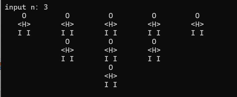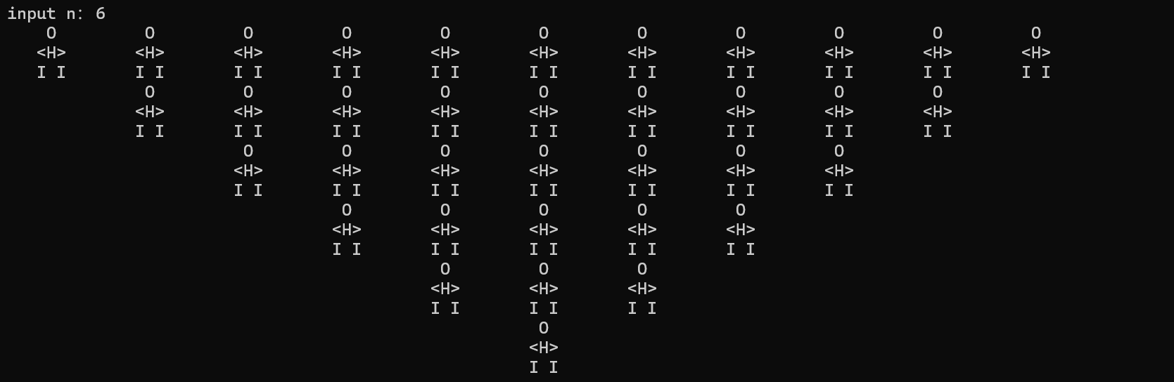 1 #include <stdio.h> 2 3 int main() { 4 int n; 5 printf("input n:"); 6 scanf("%d", &n); 7 8 int max_comb = 2 * n - 1; 9 int width_per_comb = 10; 10 int max_width = max_comb * width_per_comb; 11 12 int k; 13 for (k = n; k >= 1; k--) { 14 int comb = 2 * k - 1; 15 int current_width = comb * width_per_comb; 16 int space_num = (max_width - current_width) / 2; 17 18 printf("%*s", space_num, ""); 19 int i; 20 for (i = 0; i < comb; i++) 21 printf(" O "); 22 printf("\n"); 23 24 printf("%*s", space_num, ""); 25 for (i = 0; i < comb; i++) 26 printf(" <H> "); 27 printf("\n"); 28 29 printf("%*s", space_num, ""); 30 for (i = 0; i < comb; i++) 31 printf(" I I "); 32 printf("\n"); 33 } 34 35 return 0; 36 }