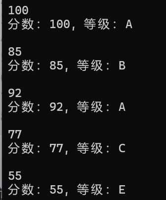 1 #include <stdio.h> 2 3 char score_to_grade(int score); 4 5 int main(){ 6 int score; 7 char grade; 8 while(scanf("%d",&score)!= EOF){ 9 grade = score_to_grade(score); 10 printf("分数:%d, 等级:%c\n\n", score, grade); 11 } 12 13 return 0; 14 } 15 16 char score_to_grade(int score){ 17 char ans; 18 19 switch(score/10){ 20 case 10: 21 case 9: ans = 'A';break; 22 case 8: ans = 'B';break; 23 case 7: ans = 'C';break; 24 case 6: ans = 'D';break; 25 default: ans = 'E'; 26 } 27 28 return ans; 29 }