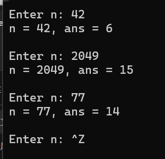 1 #include <stdio.h> 2 3 int sum_digits(int n); 4 5 int main(){ 6 int n; 7 int ans; 8 9 while(printf("Enter n: "), scanf("%d", &n) != EOF){ 10 ans = sum_digits(n); 11 printf("n = %d, ans = %d\n\n", n, ans); 12 } 13 14 return 0; 15 } 16 17 int sum_digits(int n){ 18 int ans = 0; 19 20 while(n != 0){ 21 ans += n % 10; 22 n /= 10; 23 } 24 25 return ans; 26 }