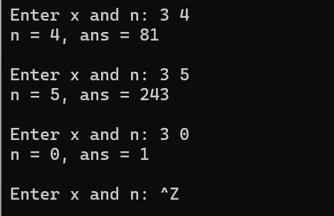 1 #include <stdio.h> 2 3 int power(int x, int n); 4 5 int main(){ 6 int x, n; 7 int ans; 8 9 while(printf("Enter x and n: "), scanf("%d%d", &x, &n) != EOF){ 10 ans = power(x, n); 11 printf("n = %d, ans = %d\n\n", n, ans); 12 } 13 14 return 0; 15 } 16 17 int power(int x, int n){ 18 int t; 19 20 if(n == 0) 21 return 1; 22 else if(n % 2) 23 return x * power(x, n-1); 24 else{ 25 t =power(x, n/2); 26 return t * t; 27 } 28 }