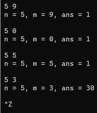 1 #include <stdio.h> 2 3 int func(int n, int m); 4 5 int main(){ 6 int n, m; 7 int ans; 8 9 while(scanf("%d%d", &n, &m) != EOF) { 10 ans = func(n, m); 11 printf("n = %d, m = %d, ans = %d\n\n", n, m, ans); 12 } 13 14 return 0; 15 } 16 17 int func(int n, int m){ 18 if (m == 0 || m == n) 19 return 1; 20 21 if (m > n - m) 22 return func(n, n - m); 23 24 return func(n - 1, m - 1) * n / m; 25 }