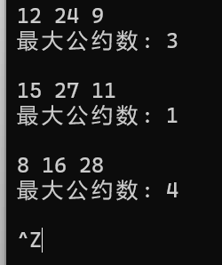 1 #include <stdio.h> 2 3 int gcd(int a, int b, int c); 4 5 int main() { 6 int a, b, c; 7 int ans; 8 9 while(scanf("%d%d%d", &a, &b, &c) != EOF) { 10 ans = gcd(a, b, c); // 函数调用 11 printf("最大公约数: %d\n\n", ans); 12 } 13 14 return 0; 15 } 16 17 int gcd(int a, int b, int c){ 18 if (a == 0 && b == 0 && c == 0) 19 return 0; 20 21 a = abs(a); b = abs(b); c = abs(c); 22 int min_val = -1; 23 24 if (a != 0) 25 min_val = a; 26 if (b != 0 && (min_val == -1 || b < min_val)) 27 min_val = b; 28 if (c != 0 && (min_val == -1 || c < min_val)) 29 min_val = c; 30 int i; 31 for (i = min_val; i >= 1; i--) { 32 if ((a % i == 0 || a == 0) && (b % i == 0 || b == 0) && (c % i == 0 || c == 0)) { 33 return i; 34 } 35 } 36 return 1; 37 }