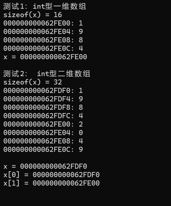 1.⼆维int型数组x是按⾏连续存放的。通过test2的输出可见,第一行元素地址连续递增后,第二行元素地址紧随其后,且每行首地址差为N * sizeof(int)(如N=4时差16字节)。