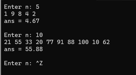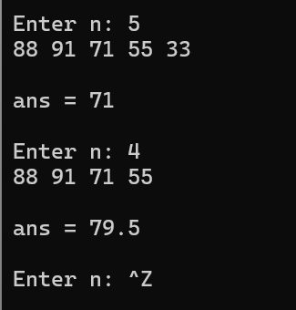 #include <stdio.h> #define N 100 double median(int x[], int n); void input(int x[], int n); int main(){ int x[N]; int n; double ans; while(printf("Enter n: "), scanf("%d", &n) != EOF){ input(x, n); ans = median(x, n); printf("ans = %g\n\n", ans); } return 0; } double median(int x[], int n){ int i, j; for(i = 0; i < n-1; i++) for(j = 0; j < n-i-1; j++) if(x[j] > x[j+1]){ int temp = x[j]; x[j] = x[j+1]; x[j+1] = temp; } printf("\n"); if(n % 2) return x[n/2]; else return (x[n/2-1] + x[n/2])/2.0; } void input(int x[], int n){ int i; for(i=0; i < n; ++i) scanf("%d", &x[i]); }