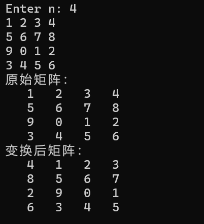 1 #include <stdio.h> 2 #define N 100 3 4 void input(int x[][N], int n); 5 void output(int x[][N], int n); 6 void rotate_to_right(int x[][N], int n); 7 8 int main(){ 9 int x[N][N]; 10 int n; 11 12 printf("Enter n: "); 13 scanf("%d", &n); 14 input(x, n); 15 16 printf("原始矩阵:\n"); 17 output(x, n); 18 rotate_to_right(x, n); 19 20 printf("变换后矩阵:\n"); 21 output(x, n); 22 23 return 0; 24 } 25 26 void input(int x[][N], int n) { 27 int i, j; 28 29 for (i = 0; i < n; ++i) { 30 for (j = 0; j < n; ++j) 31 scanf("%d", &x[i][j]); 32 } 33 } 34 35 void output(int x[][N], int n) { 36 int i, j; 37 38 for (i = 0; i < n; ++i) { 39 for (j = 0; j < n; ++j) 40 printf("%4d", x[i][j]); 41 printf("\n"); 42 } 43 } 44 45 void rotate_to_right(int x[][N], int n){ 46 int i, j; 47 48 for (i = 0; i < n; ++i) { 49 int temp = x[i][n-1]; 50 for (j = n-1; j > 0; --j) 51 x[i][j] = x[i][j-1]; 52 x[i][0] = temp; 53 } 54 }