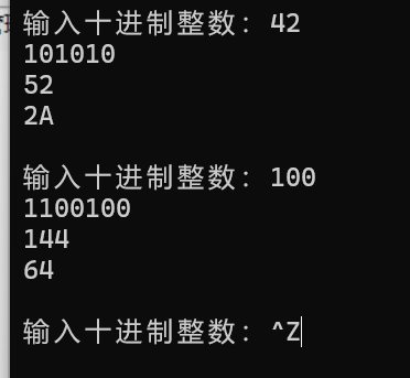 1 #include <stdio.h> 2 #define N 100 3 4 void dec_to_n(int x, int n); 5 6 int main(){ 7 int x; 8 9 while(printf("输入十进制整数:"), scanf("%d", &x) != EOF){ 10 dec_to_n(x, 2); 11 dec_to_n(x, 8); 12 dec_to_n(x, 16); 13 14 printf("\n"); 15 } 16 17 return 0; 18 } 19 20 void dec_to_n(int x, int n){ 21 int i, d; 22 char map[] = "0123456789ABCDEF"; 23 24 int count = 0; 25 char a[N]; 26 27 do{ 28 i = x%n; 29 d = x/n; 30 a[count] = map[i]; 31 count++; 32 x=d; 33 }while(x > 0); 34 35 for (--count;count >= 0; --count) { 36 printf("%c", a[count]); 37 } 38 printf("\n"); 39 40 }