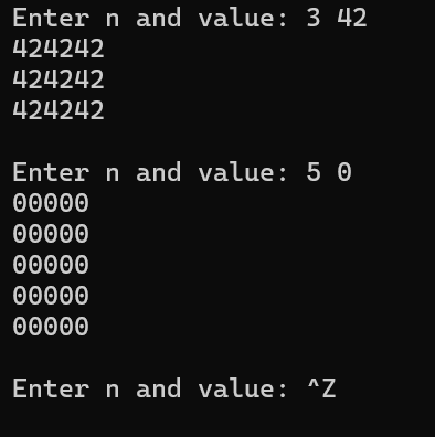 1 #include <stdio.h> 2 #define N 100 3 4 void output(int x[][N], int n); 5 void init(int x[][N], int n, int value); 6 7 int main(){ 8 int x[N][N]; 9 int n, value; 10 11 while(printf("Enter n and value: "), scanf("%d%d", &n, & value) != EOF){ 12 init(x, n, value); 13 output(x, n); 14 printf("\n"); 15 } 16 17 return 0; 18 } 19 20 void output(int x[][N], int n){ 21 int i, j; 22 23 for(i=0; i < n; ++i){ 24 for(j=0; j < n; ++j) 25 printf("%d", x[i][j]); 26 printf("\n"); 27 } 28 } 29 30 void init(int x[][N], int n, int value){ 31 int i, j; 32 33 for(i=0; i < n; ++i) 34 for(j=0; j < n; ++j) 35 x[i][j] = value; 36 37 }