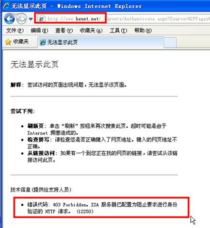 在用ISA Server 发布SharePoint 2010的网站时,在登录站点时,出现“错误代码: 403 Forbidden。ISA 服务器已配置为阻止要求进行身份验证的 HTTP 请求。 (12250)”的错误提示,如图1所示。