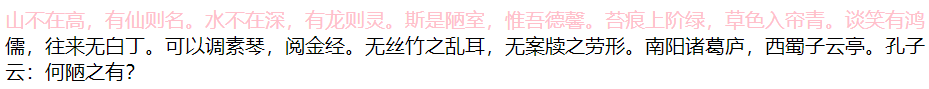 <p>山不在高,有仙则名。水不在深,有龙则灵。斯是陋室,惟吾德馨。苔痕上阶绿,草色入帘青。谈笑有鸿儒,往来无白丁。可以调素琴,阅金经。无丝竹之乱耳,无案牍之劳形。南阳诸葛庐,西蜀子云亭。孔子云:何陋之有?</p> p::first-line { color: pink;