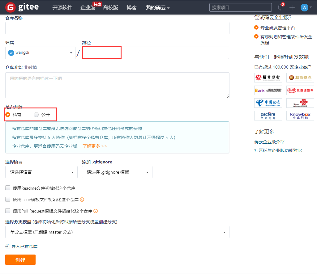 都会跳到同一个页面,填入你起的仓库名,是否开源(公司的项目都是私有),语言随便不选也可以,再有就是单分支模型,要根据需要选择,