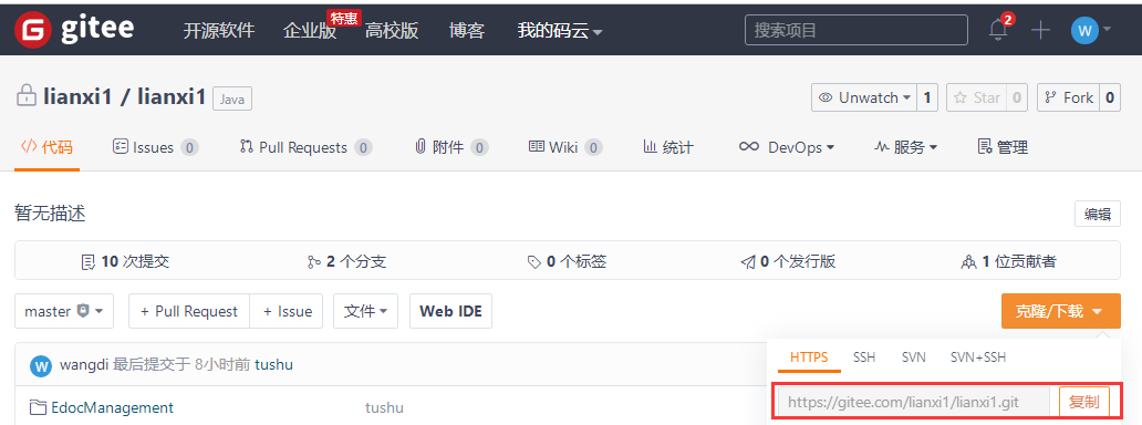 https://gitee.com/lianxi1/lianxi1.git是从码云上复制过来的