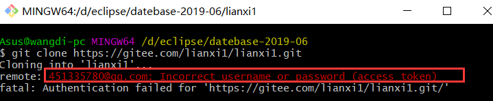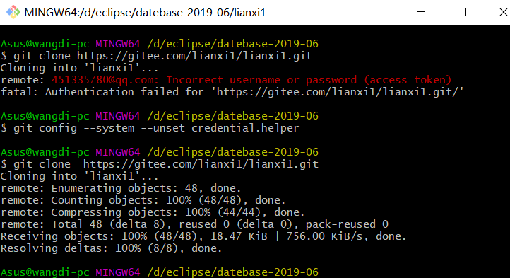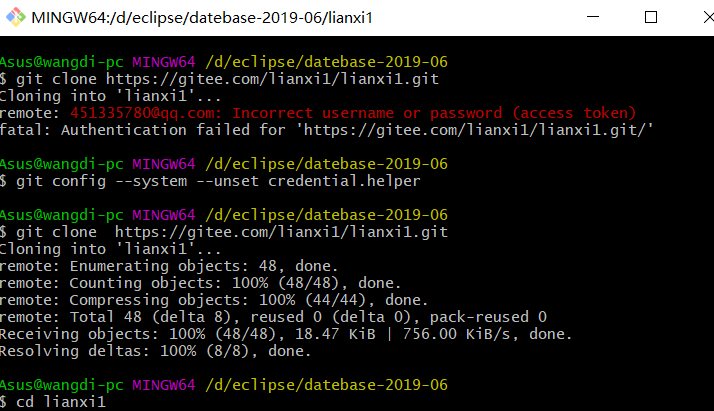 如果出现次错误可以用:git config --system --unset credential.helper 命令,使用此命令后再此输入git clone https://gitee.com/lianxi1/lianxi1.git命令会重新让你输入用户名和密码输入成功后