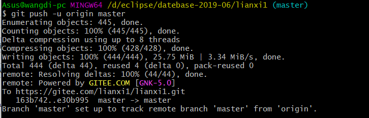 此时差最后一步命令:git push -u origin master ,此命令是把本地仓库的醒目文件提交到码云上
