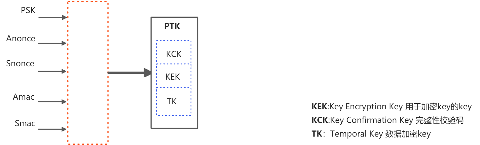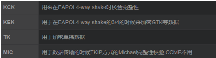 PTK包含4个部分:KCK(Key Confirmation Key),KEK(Key Encryption Key),TK(Temporal Key),MIC(Message Integrity Code)