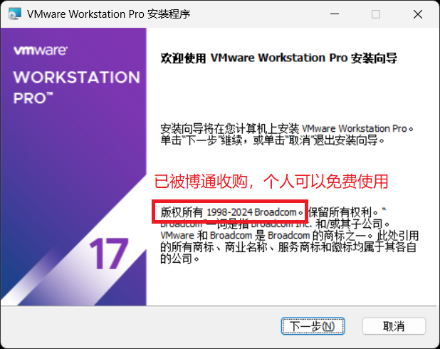 首先安装VMware虚拟机。目前最新版本(17.6.2)个人可以免费安装使用,点击安装包一步步执行安装即可。