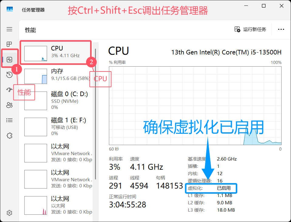 安装完毕,检查BIOS是否已启用虚拟化。按键盘最左边的Esc+Shift+Ctrl三个键调出任务管理器,点击“性能”—>“CPU”,确保有“虚拟化:已启用”的字样。
