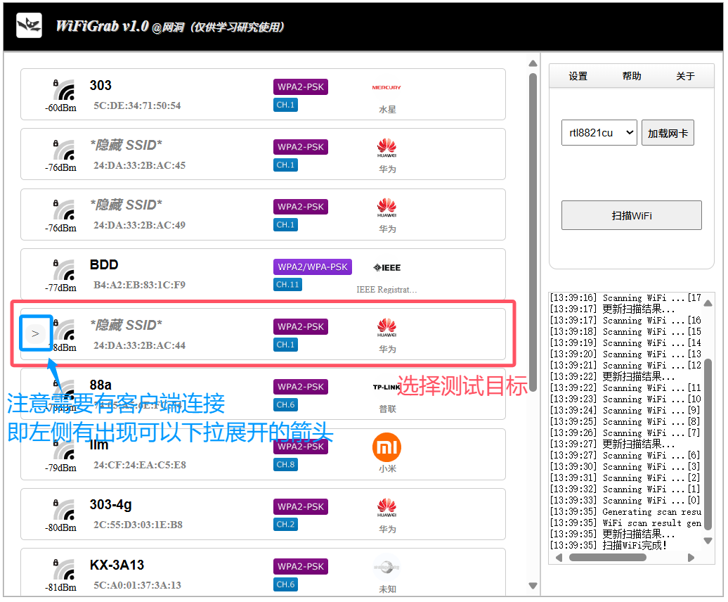 扫描结束,选择需要测试的无线网络(注意目标WiFi下需要有客户端连接,如果有客户端连接,则左侧会出现下拉箭头,可以展开看到已连接的客户端)。这里测试的是一个预