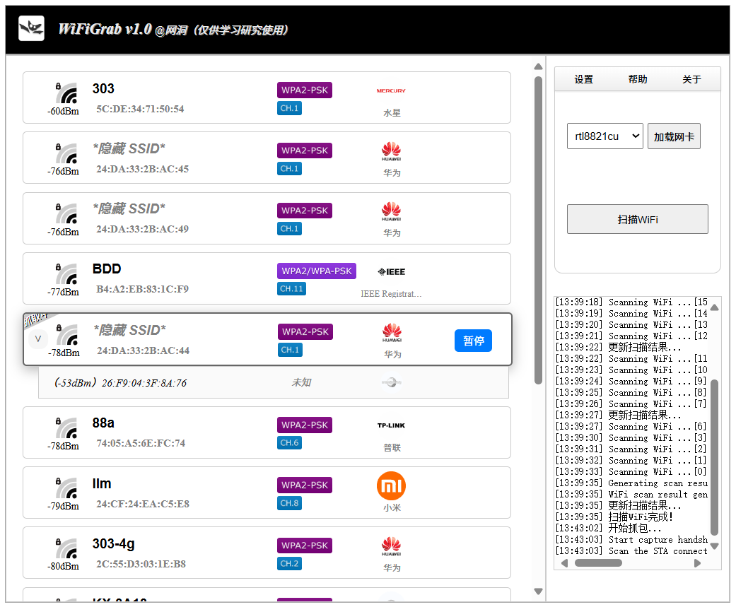 WiFiGrab是一款实用的无线安全审计软件,该软件使用简单,图形化操作界面,无需安装,一键启动,一键捕获握手报文。可自动显示隐藏SSID、支持2.4G和5G抓包。