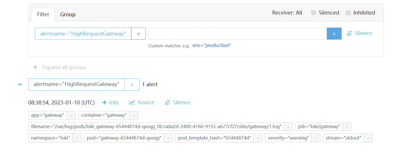 kubectl logs -f loki-read-0 -n loki# 日志中显示已经触发了规则的评估,可以看到该次查询是一个metric类型的查询而不是log类型 level=info ts=2023-01-10T08:32:54.444362252Z caller=metrics.go:133 component=ruler org_id=fake latency=fast query="(rate({app=\"gateway\"}[5m]) > 1)" query_type=metric range_type=instant length=0s step=0s duration=10.488427ms status=200 limit=0 returned_lines=0 throughput=7.2MB total_bytes=76kB total_entries=1 queue_time=0s subqueries=1 -