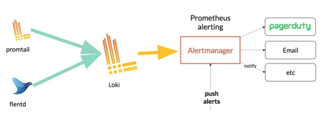 告警规则在loki的ruler微服务组件中实现,有loki 的ruler微服务组件评估生成告警然后发送给alertmanagery由具体的媒介发出通知