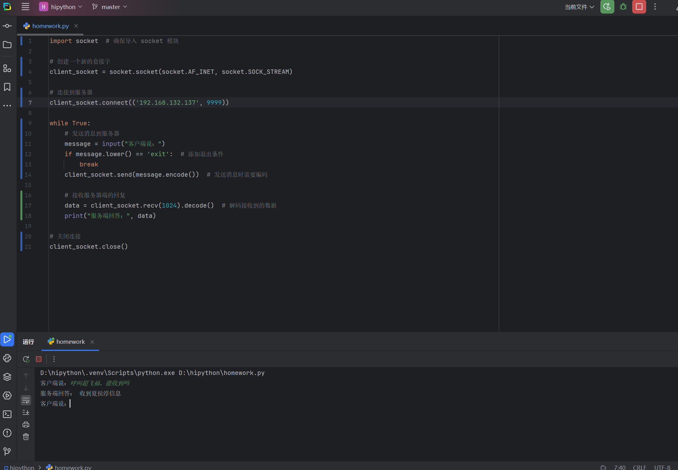 (1)创建服务端和客户端,选择一个通信端口,用Python语言编程实现通信演示程序;