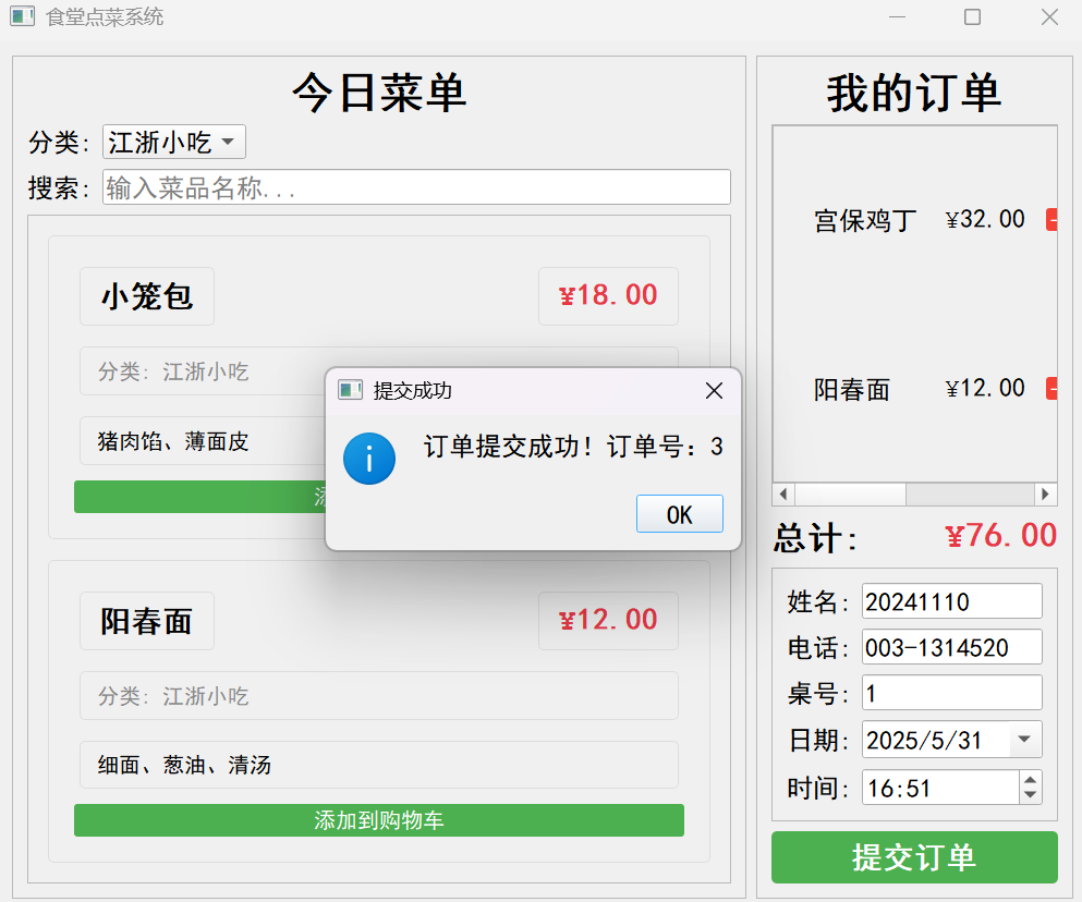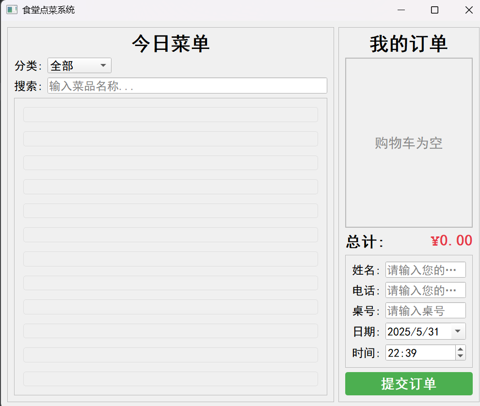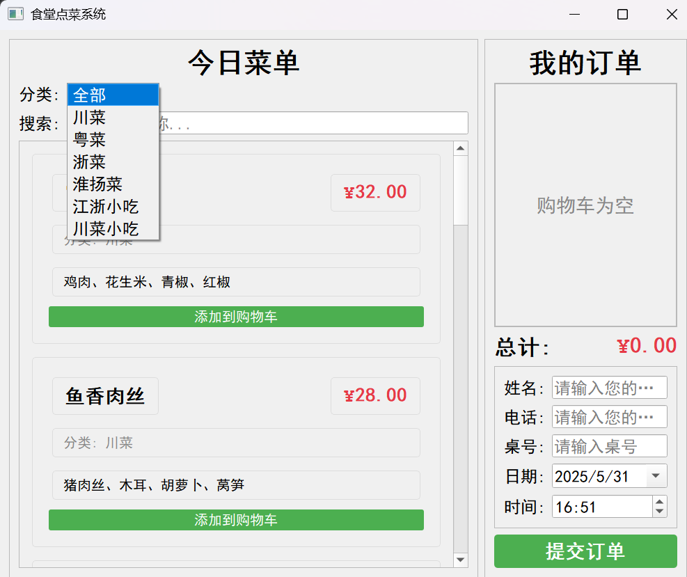 滚动区域:QScrollArea用于显示大量菜品,避免界面溢出。