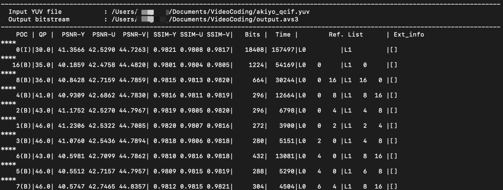(2)在macos文件夹下执行命令:./uavs3enc -i ~/Document/VideoCoding/akiyo_qcif.yuv(输入文件路径及文件名,前面是我的示例) -w 176 -h 144 --fps_num 10 --fps_den 10 -d 8 -o ~/Document/VideoCoding/output.avs3(输出文件路径及文件名,前面是我的示例,注意输出的文件的格式是avs3格式),下面是整个执行命令(如果你的文件夹和我的文件夹是一样的话):