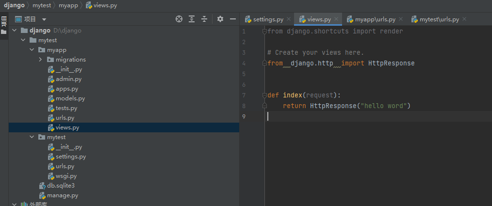 这里我们写一个简单的视图,首先打开views.py,导入 HttpResponse的模块,实现一个简单的页面展示功能